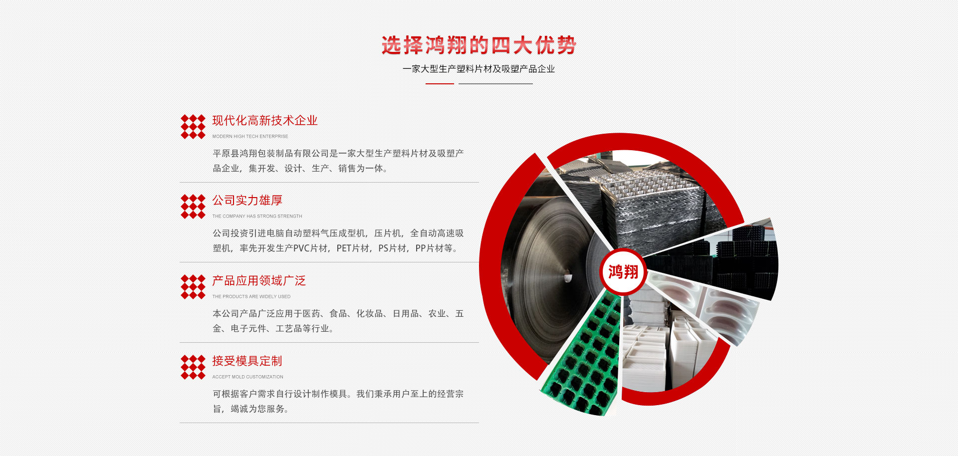 平原縣鴻翔包裝制品有限公司是一家大型生產(chǎn)塑料片材及吸塑產(chǎn)品企業(yè),本公司投資引進電腦自動塑料氣壓成型機,壓片機,全自動高速吸塑機,率先開發(fā)生產(chǎn)PVC片材,PET片材,PS片材,PP片材等,鴻翔是國內(nèi)先進的生產(chǎn)廠家之一。本公司產(chǎn)品廣泛應用于醫(yī)藥、食品、化妝品、日用品、農(nóng)業(yè)、五金、電子元件、工藝品等行業(yè),也可根據(jù)客戶需求自行設(shè)計制作模具。本公司技術(shù)力量雄厚,生產(chǎn)設(shè)備工藝先進。我們秉承用戶至上的經(jīng)營宗旨,竭誠為您服務。